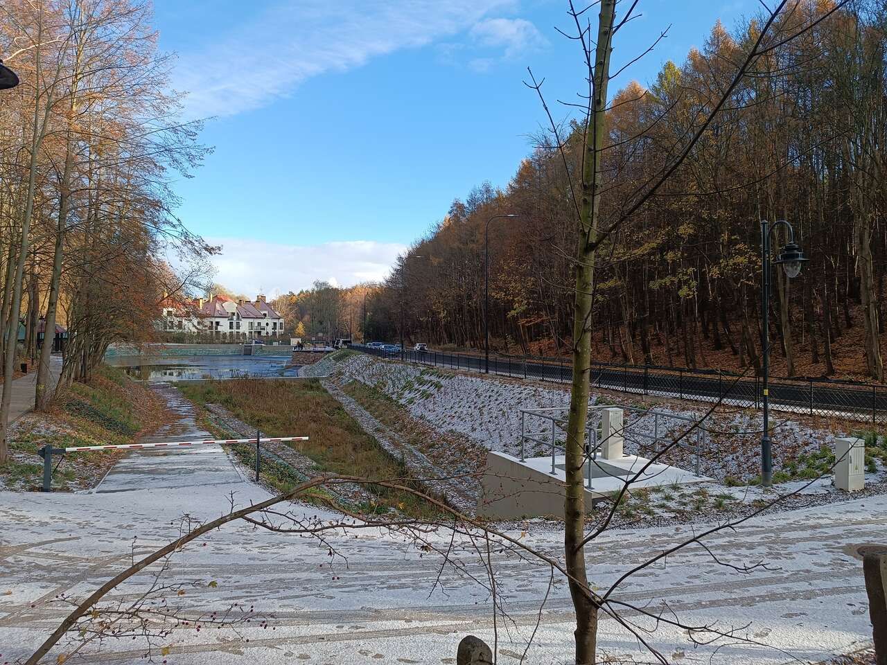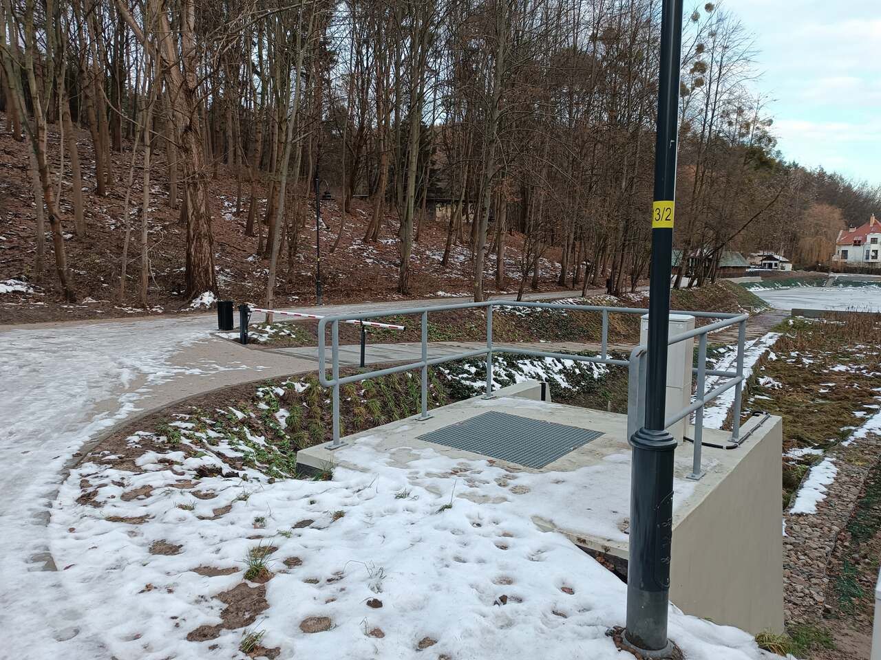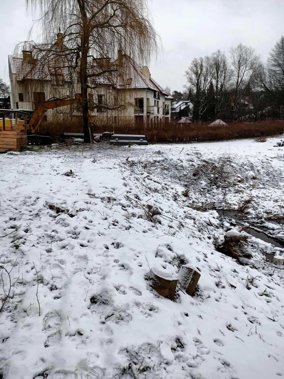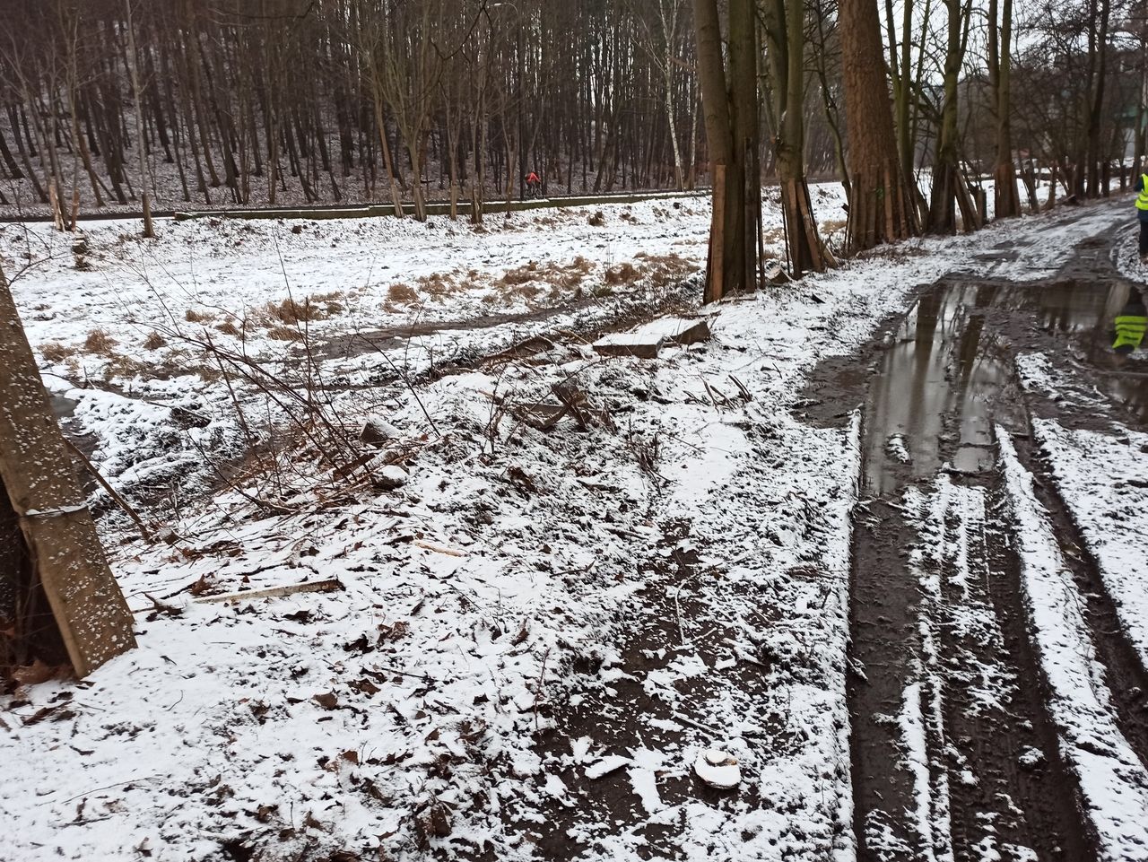 - rozebranie istniejącej budowli wylotowej do Jaśkowego Potoku oraz pozostałości konstrukcji kładki drewnianej i nieczynnych latarni ulicznych;